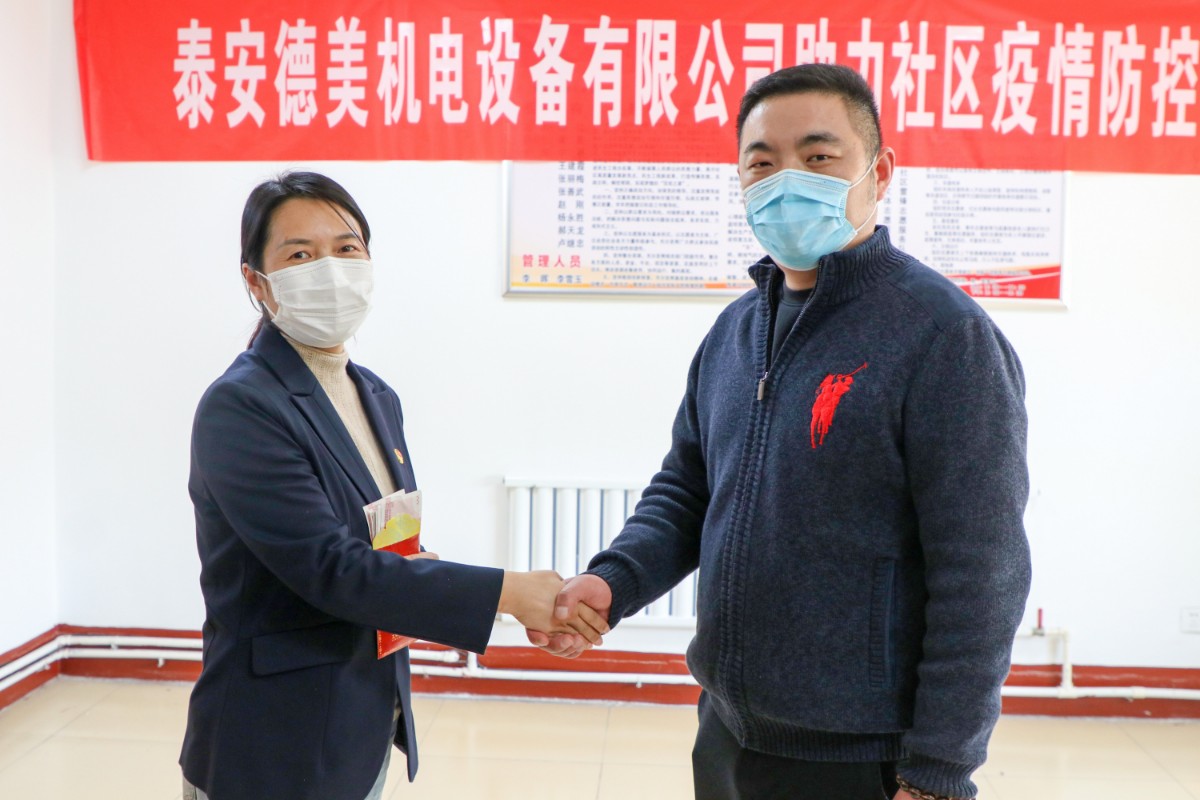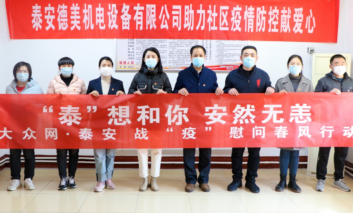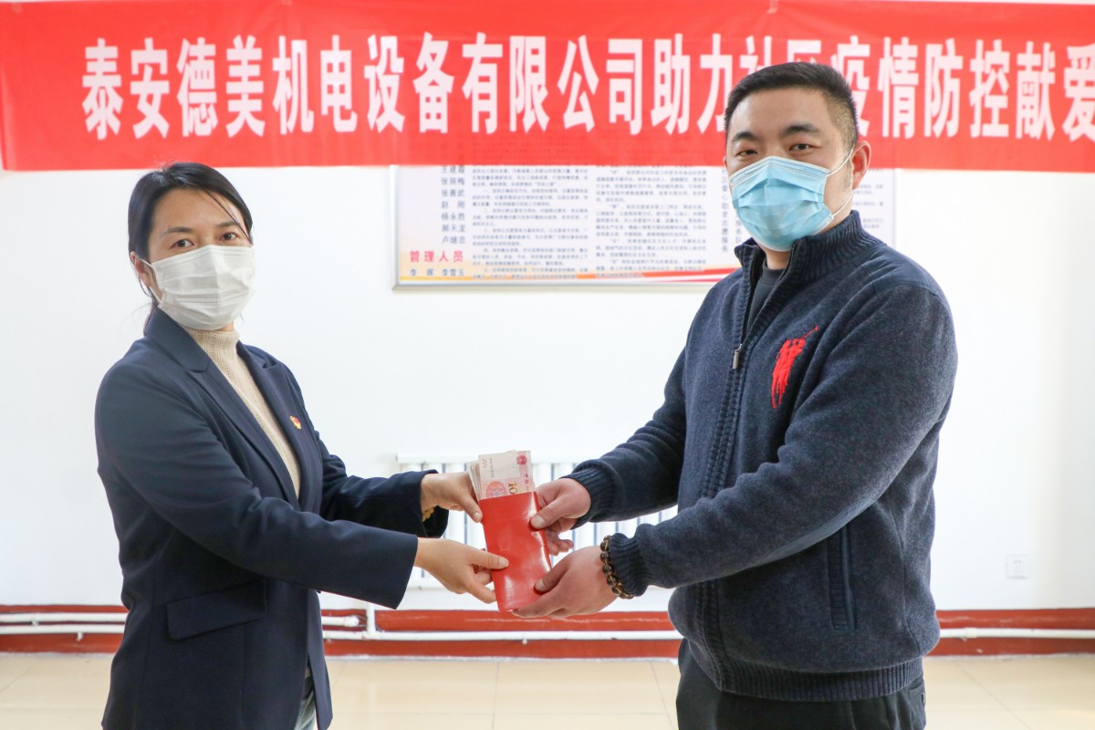 在疫情防控關(guān)鍵時(shí)期,泰安德美機電設備有限公司作為泰安國際商會(huì )副會(huì )長(cháng)單位、泰山區政協(xié)委員獻出愛(ài)心,通過(guò)市貿促會(huì )、區貿促會(huì )牽線(xiàn)搭橋,為鐵路新村捐贈防疫物資,