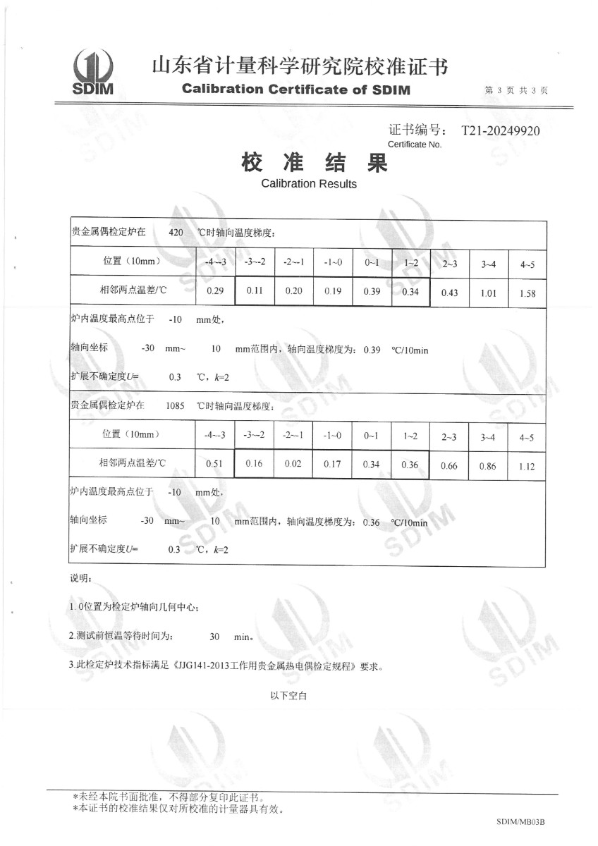 貴金屬熱電偶檢定爐(300~1000℃)校準證書(shū)