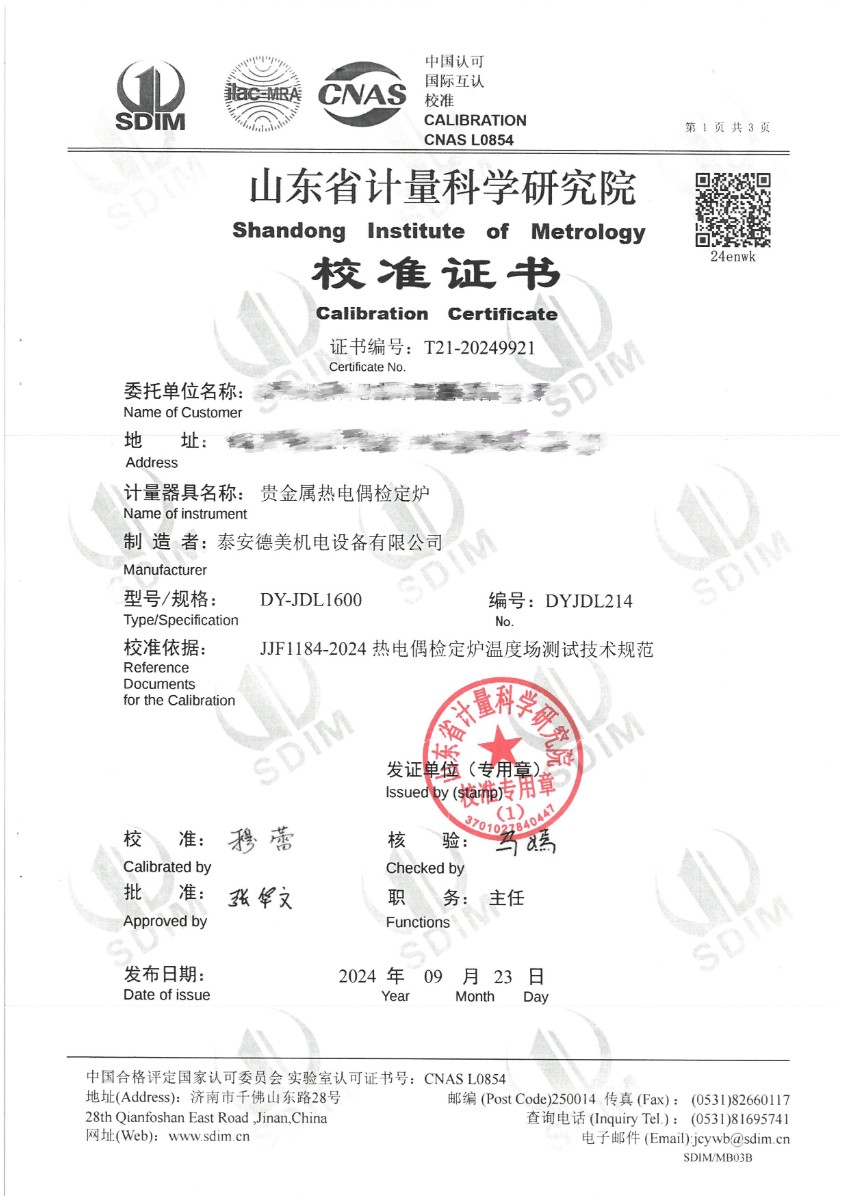 | 上一條:貴金屬熱電偶檢定爐(300~1000℃)校準證書(shū) | 下一條:智能干體儀(六位半精度)校準證書(shū) |