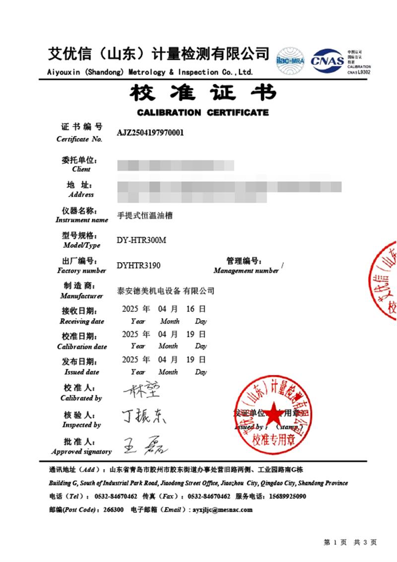 手提式恒溫油槽(70-300℃)校準證書(shū)