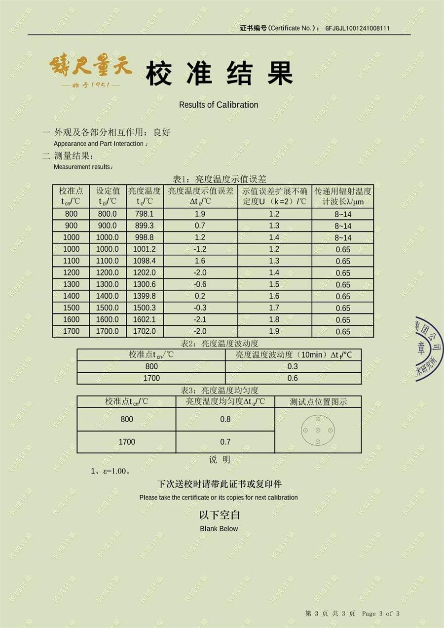 高溫黑體爐(800-1700℃)校準證書(shū)