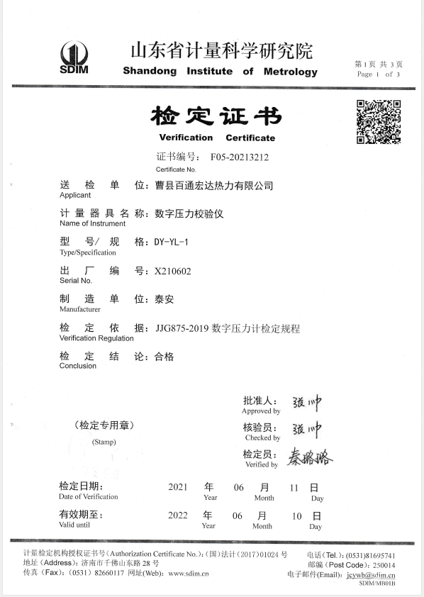 曹縣百通宏達熱力有限公司-數字壓力校驗儀 2021-6-23 本文被閱讀 15475 次