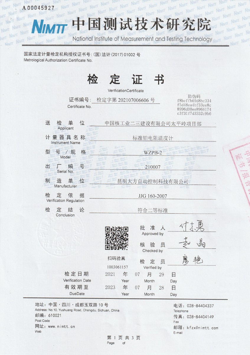 中國核工業(yè)二三建設有限公司太平嶺項目部-標準鉑電阻溫度計 2021-7-31 本文被閱讀 16546 次