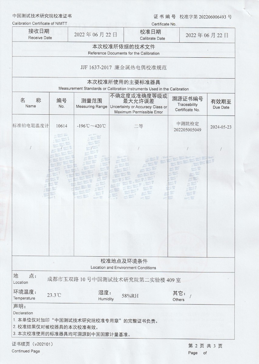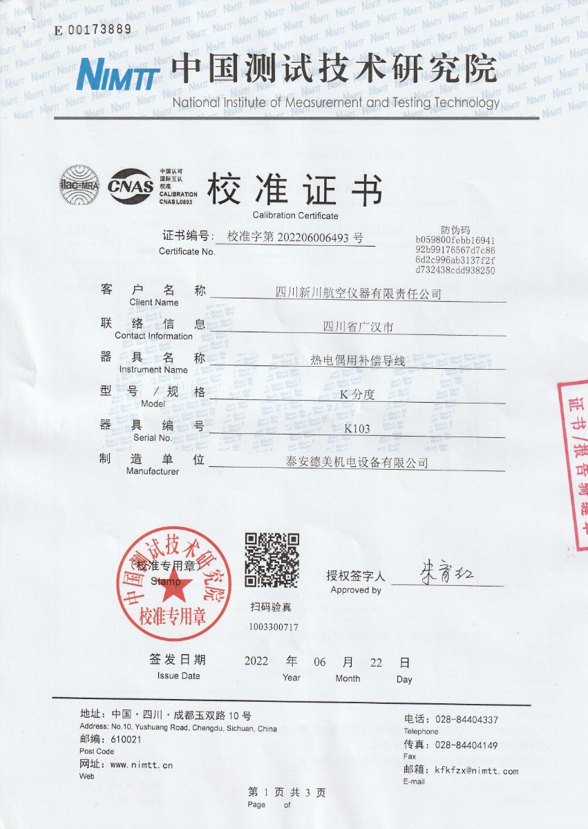 上一條:四川新川航空儀器有限責任公司-S分度補償導線(xiàn)下一條:溫濕度檢定箱校準證書(shū)
