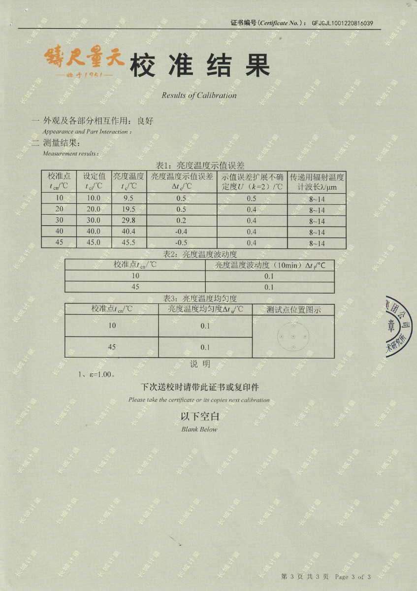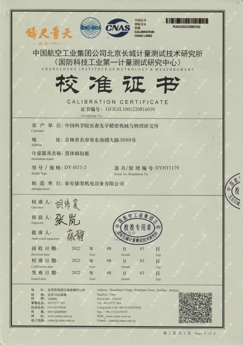 | 上一條:中國科學(xué)院長(cháng)春光學(xué)精密機械與物理研究所-黑體爐DY-HT1-1 | 下一條:溫濕度檢定箱校準證書(shū) |