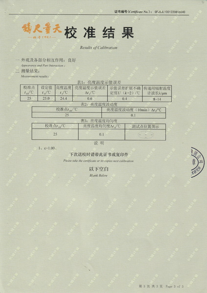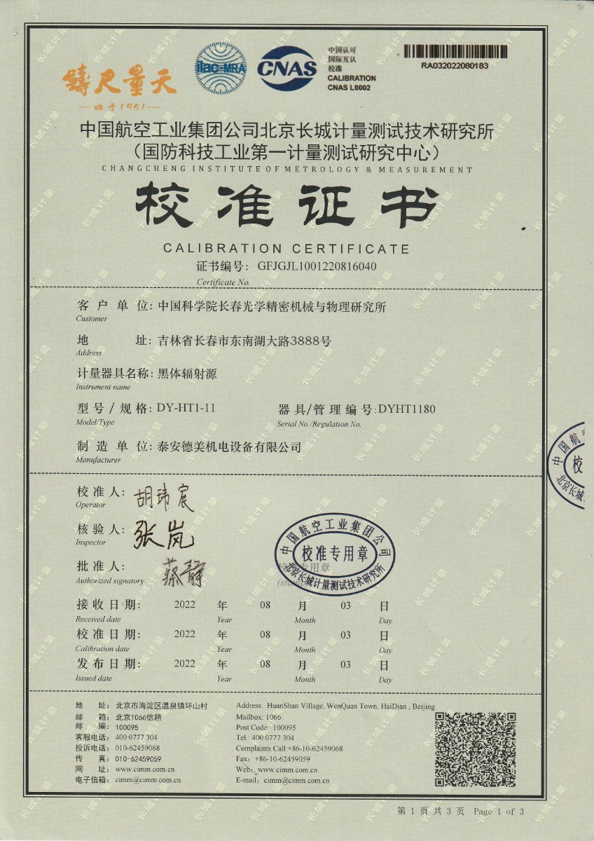 | 上一條:中國科學(xué)院長(cháng)春光學(xué)精密機械與物理研究所-黑體爐DY-HT1-2 | 下一條:溫濕度檢定箱校準證書(shū) |
