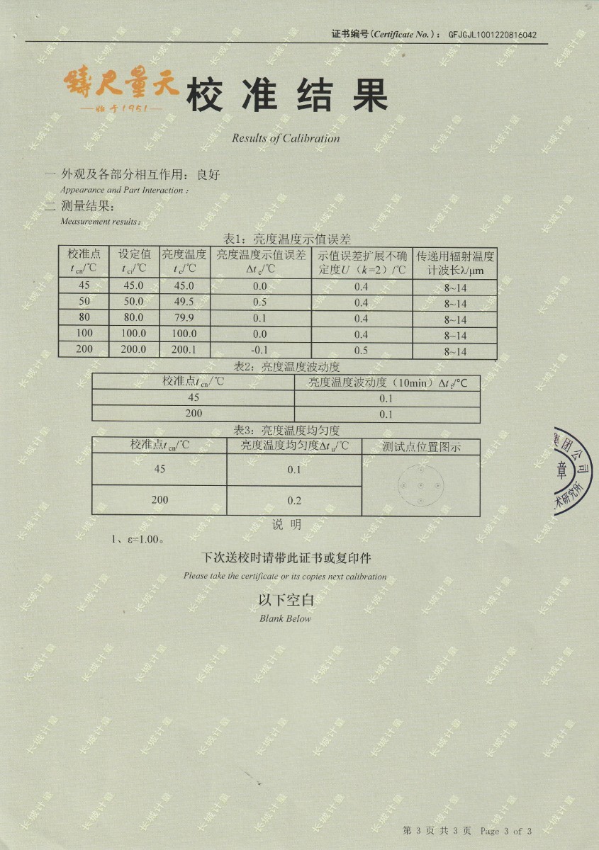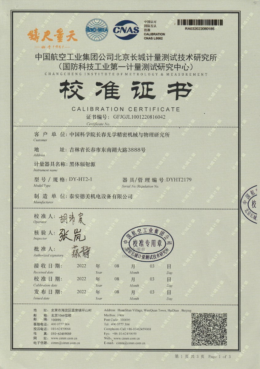 | 上一條:中國科學(xué)院長(cháng)春光學(xué)精密機械與物理研究所-黑體爐DY-HT1-11 | 下一條:溫濕度檢定箱校準證書(shū) |
