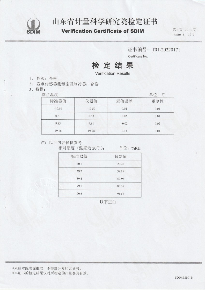 西安天牧儀器儀表有限公司 精密露點(diǎn)儀 檢定證書(shū)