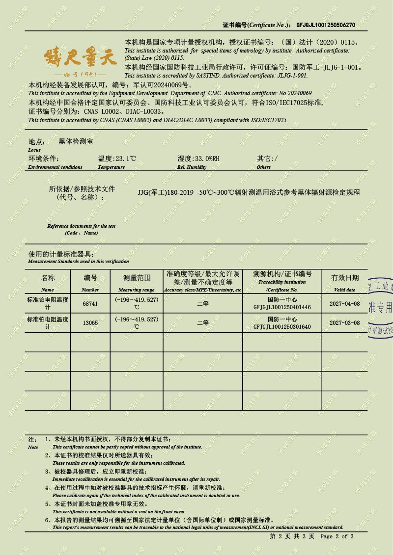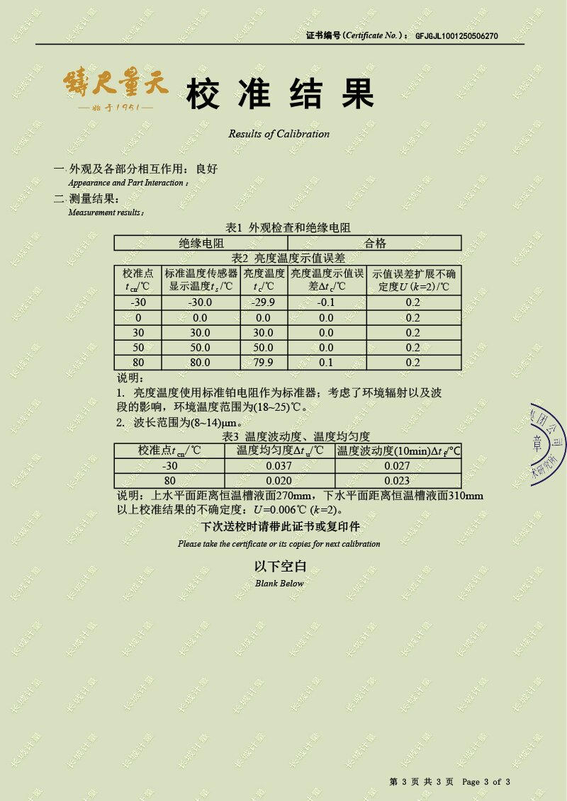 | 上一條:面源黑體輻射源(50-500℃)校準證書(shū) | 下一條:智能干體儀(六位半精度)校準證書(shū) |