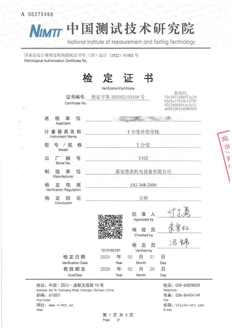 T分度補償導線(xiàn)檢定證書(shū) 2025-2-25 本文被閱讀 4388 次