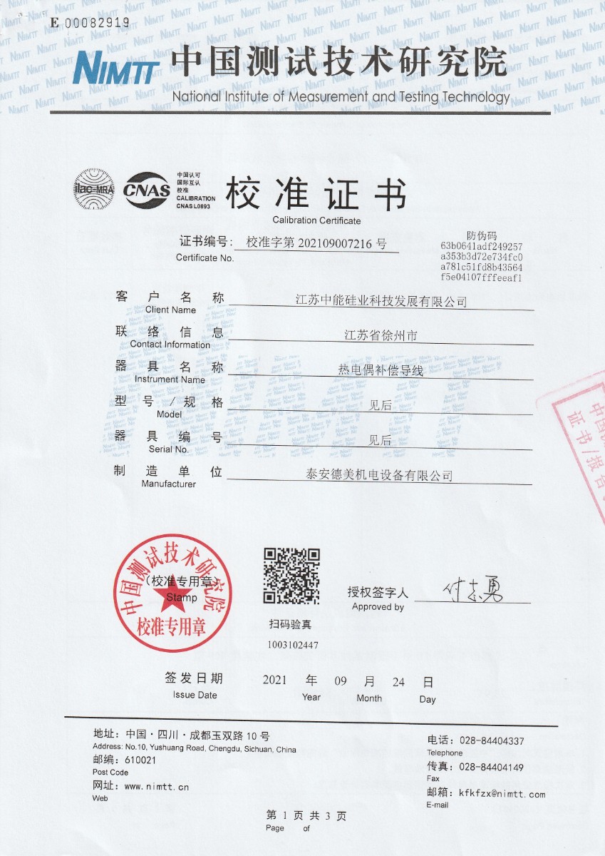 | 上一條:江蘇中能硅業(yè)科技發(fā)展有限公司-零度恒溫器 | 下一條:智能干體儀(六位半精度)校準證書(shū) |
