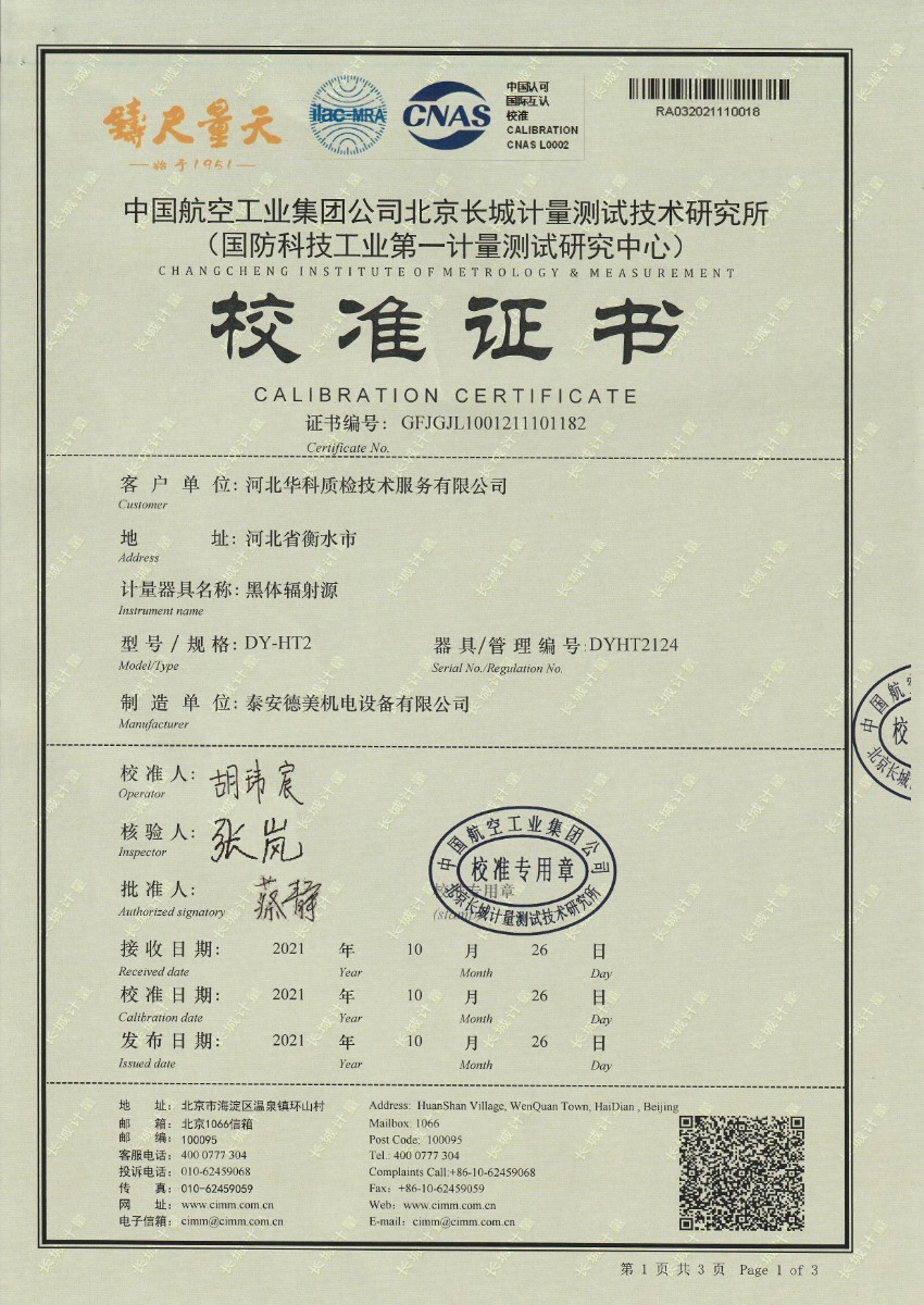 | 上一條:河北華科質(zhì)檢技術(shù)服務(wù)有限公司-黑體輻射源(DY-HT1) | 下一條:智能干體儀(六位半精度)校準證書(shū) |