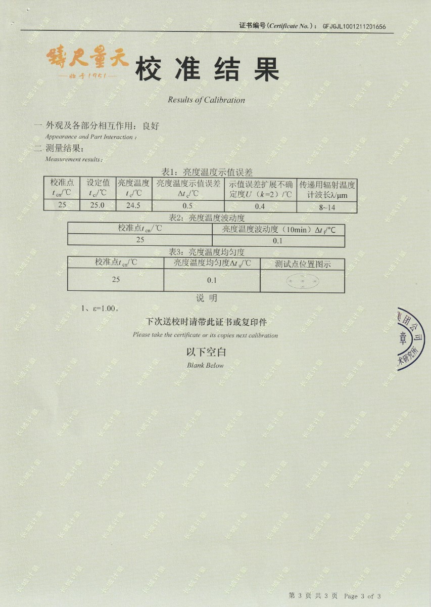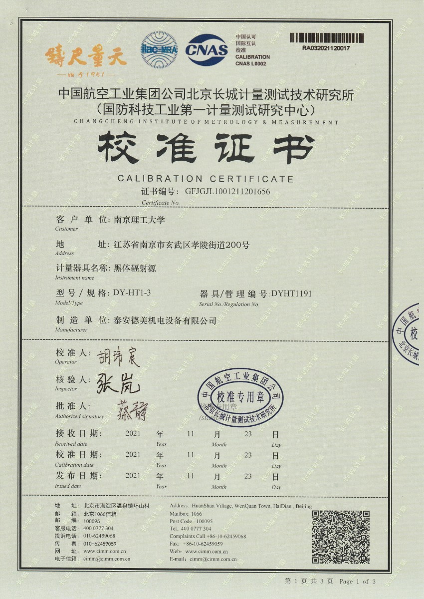 南京理工大學(xué)-黑體輻射源校準證書(shū)25℃ 2021-12-4 本文被閱讀 16010 次