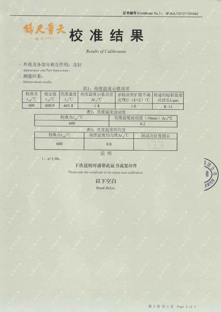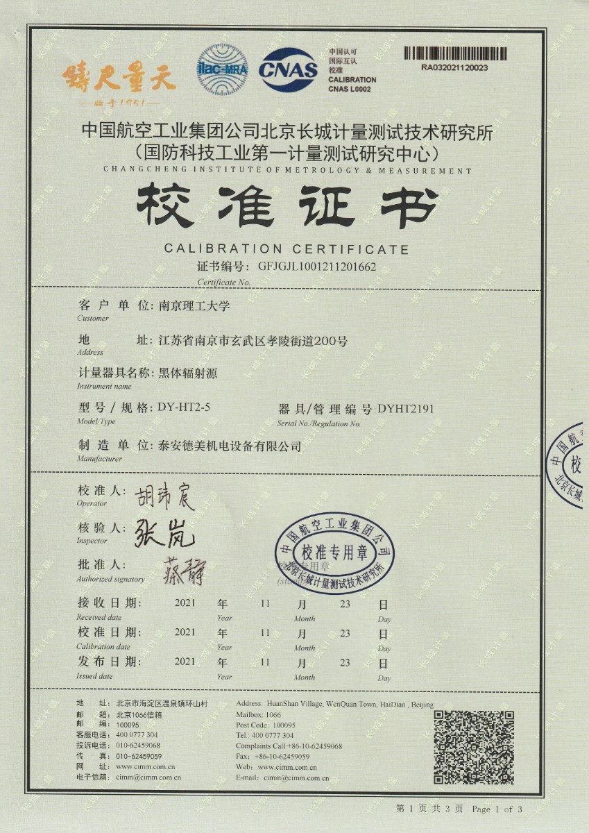 南京理工大學(xué)-黑體輻射源校準證書(shū)600℃ 2021-12-4 本文被閱讀 14173 次