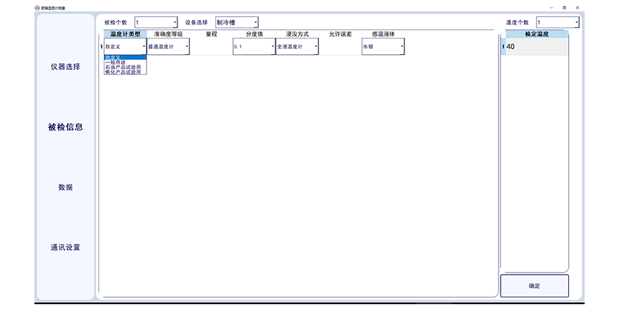 4.可進(jìn)行玻璃溫度計的類(lèi)型選擇,選擇分度值、浸沒(méi)類(lèi)型計允差,判斷溫度是否合格,