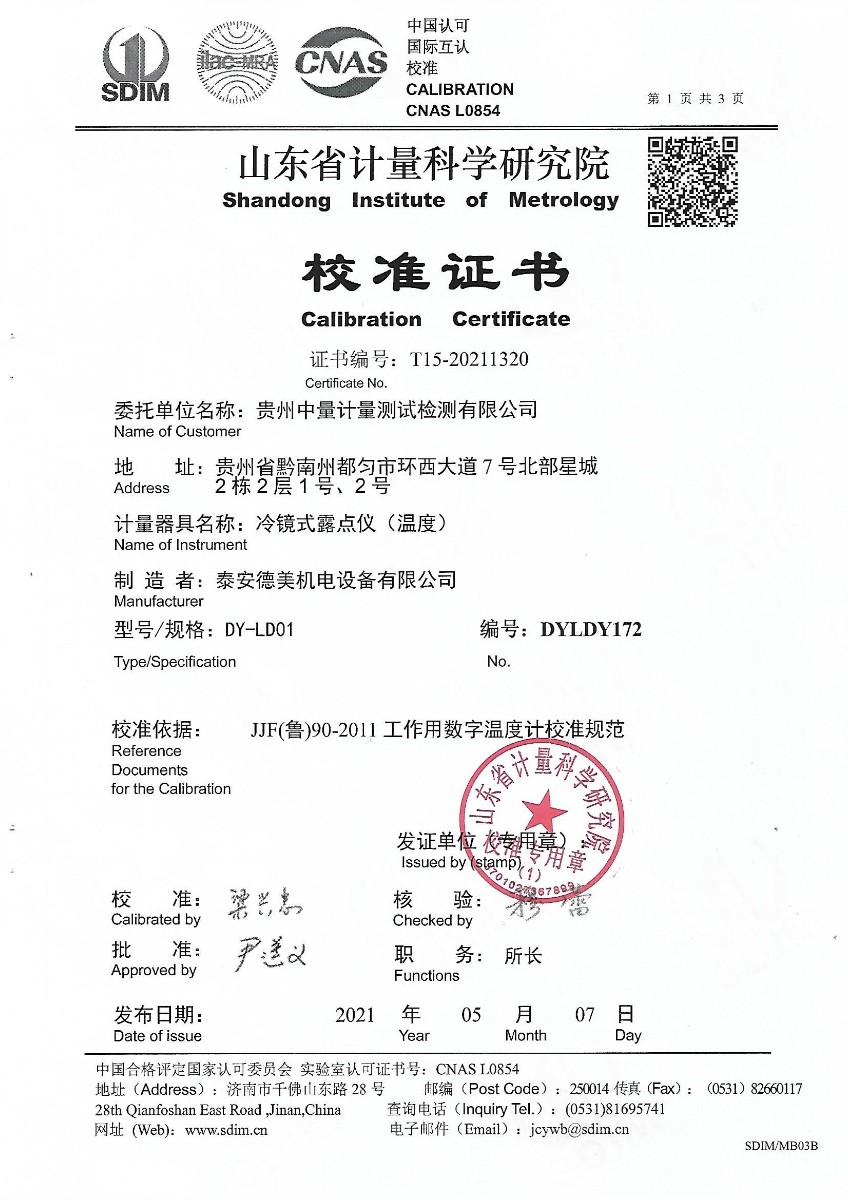 貴州中量計量測試檢測有限公司-冷鏡式露點(diǎn)儀校準證書(shū) 2021-5-15 本文被閱讀 15306 次
