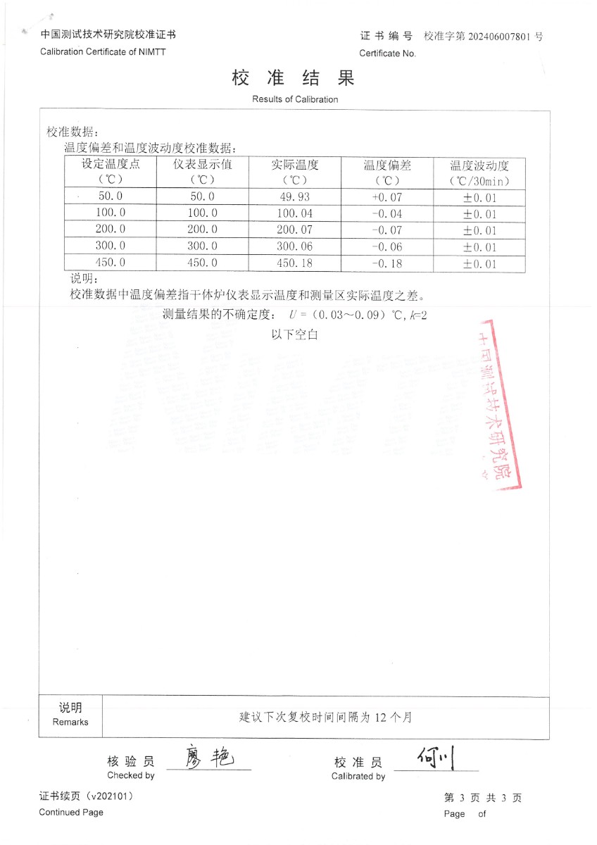 中溫干體爐(50~450℃)校準證書(shū) 2024-7-1 本文被閱讀 6105 次