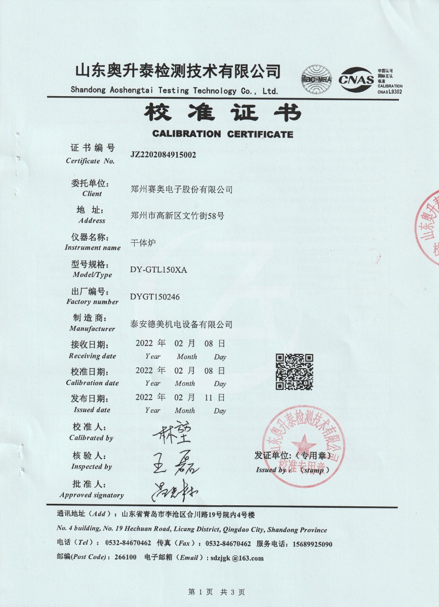 上一條:鄭州賽奧電子股份有限公司-干體爐DYGT150245下一條:智能干體儀(六位半精度)校準證書(shū)