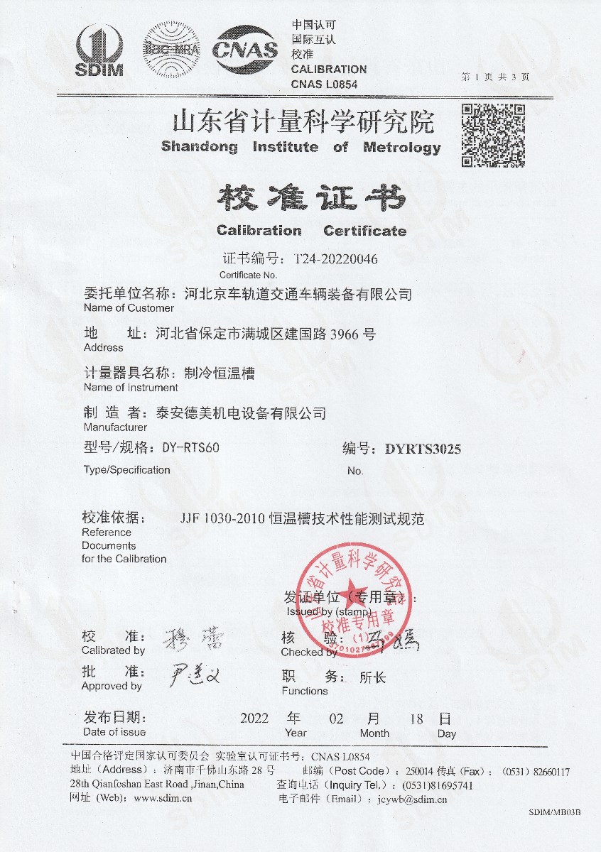 | 上一條:河北京車(chē)軌道交通車(chē)輛裝備有限公司-熱電偶檢定爐 | 下一條:智能干體儀(六位半精度)校準證書(shū) |