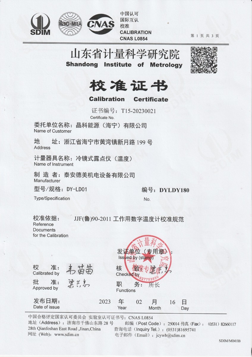 | 上一條:晶科能源(海寧)有限公司 冷鏡式露點(diǎn)儀 檢定證書(shū) | 下一條:智能干體儀(六位半精度)校準證書(shū) |