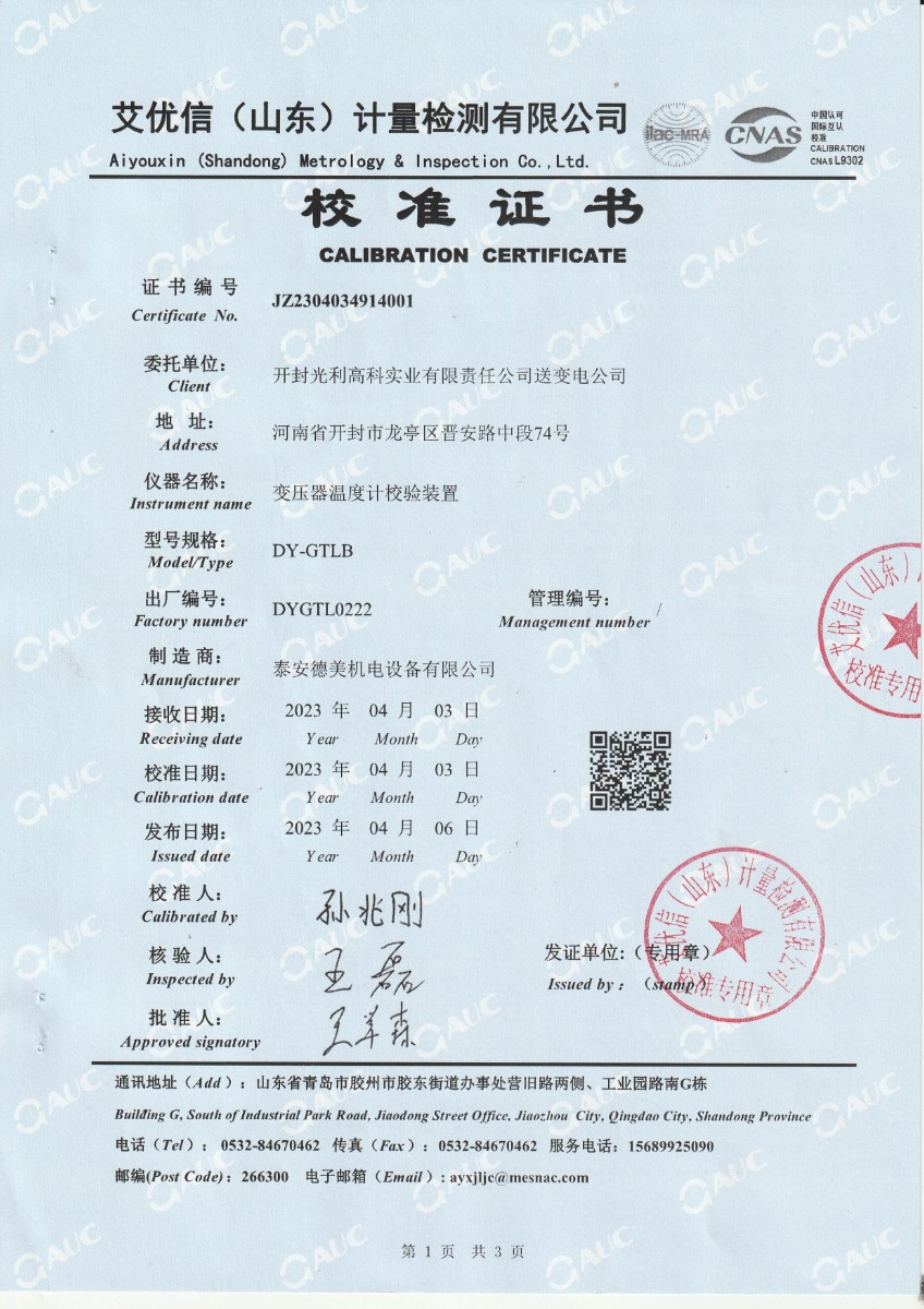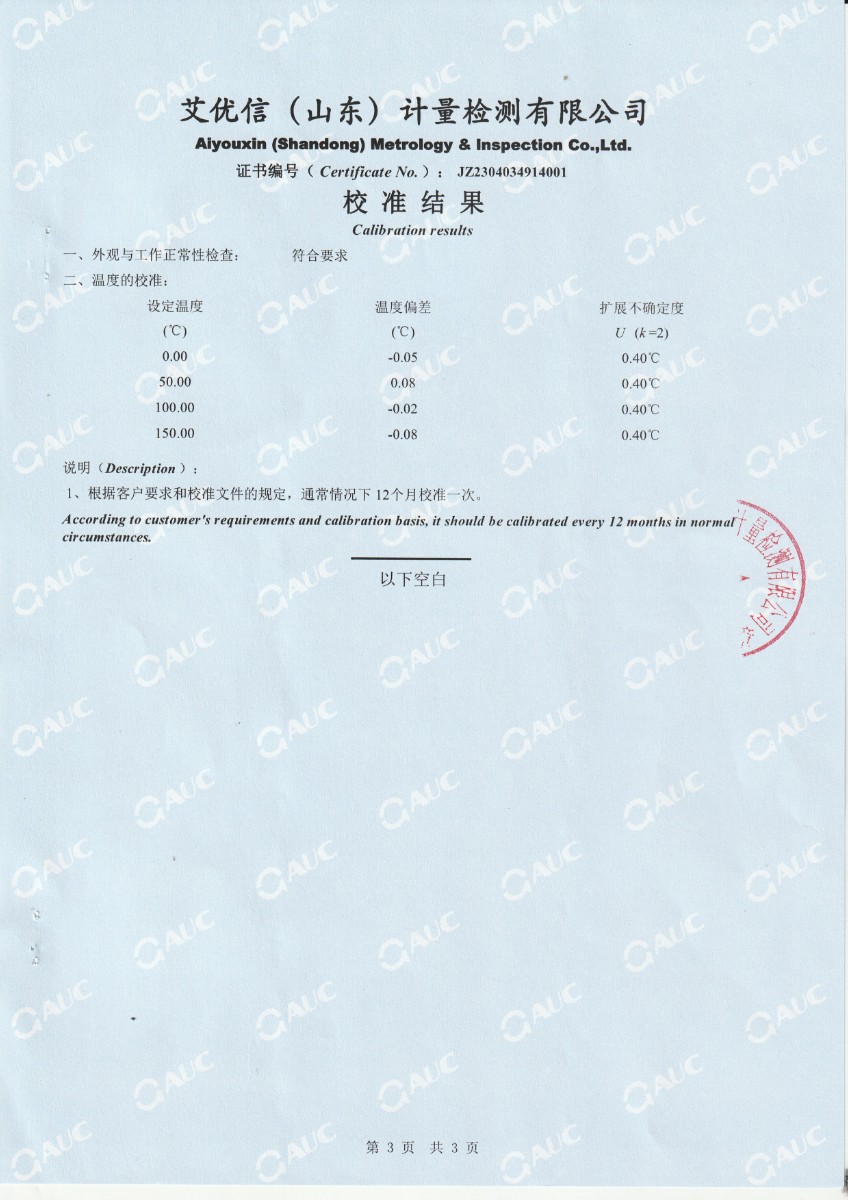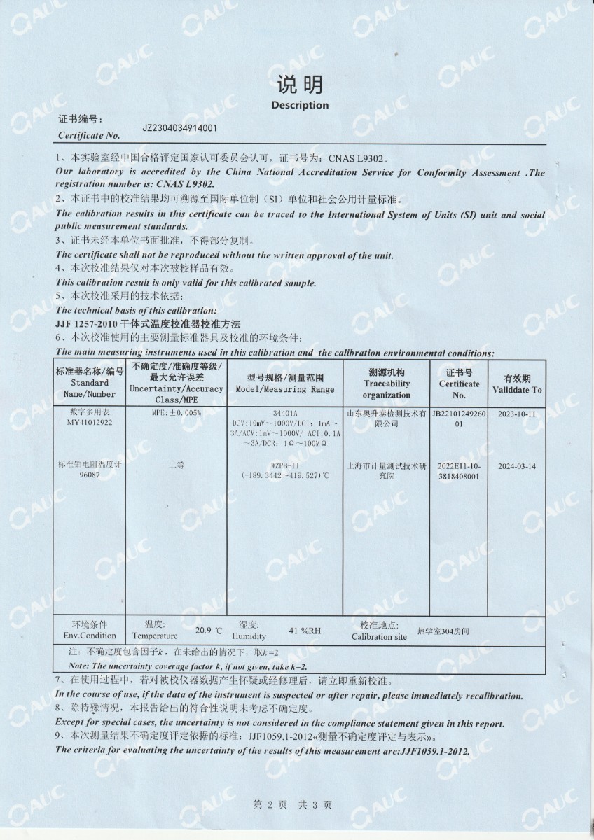 | 上一條:中財鋰膜(南京)有限公司 中溫干體爐 校準證書(shū) | 下一條:智能干體儀(六位半精度)校準證書(shū) |