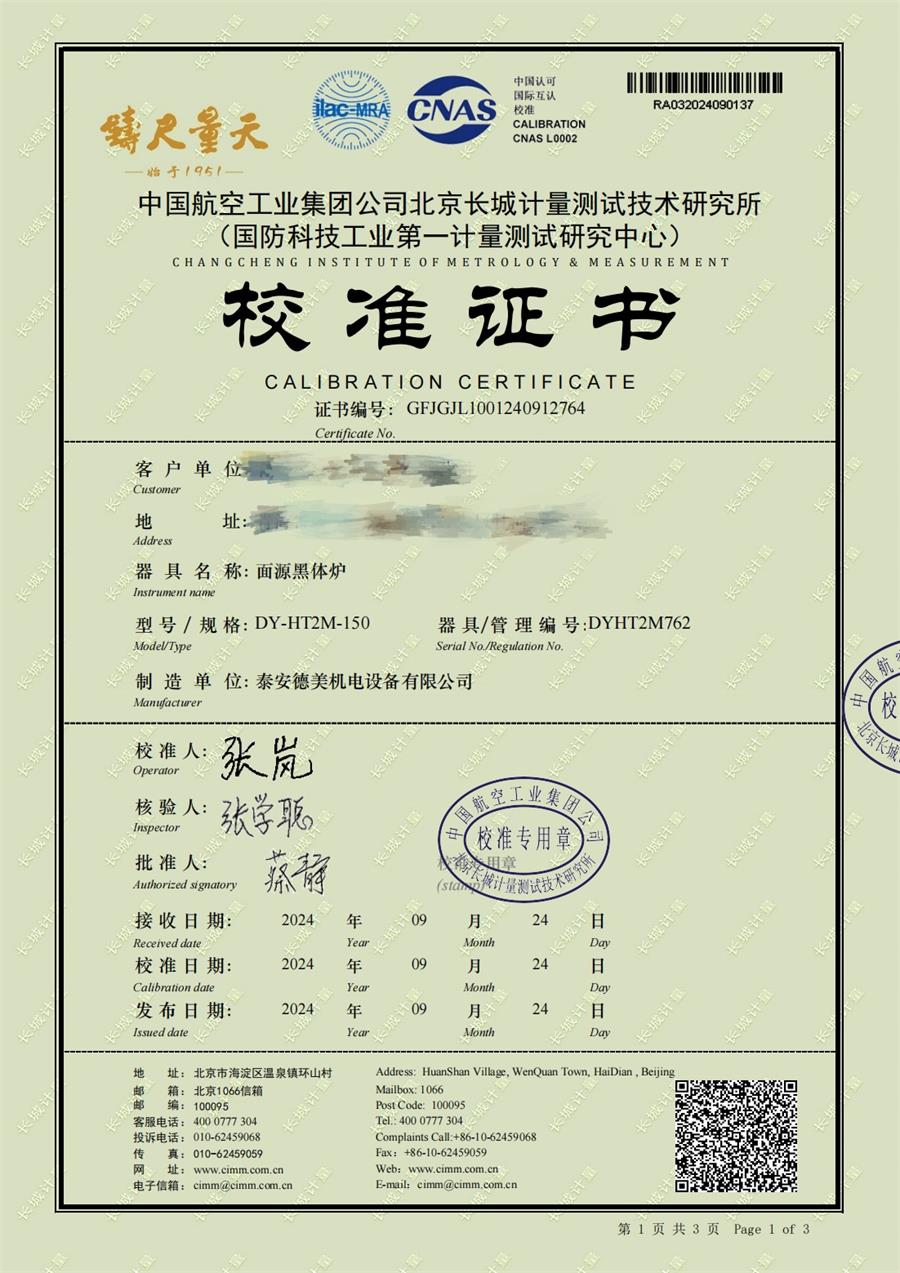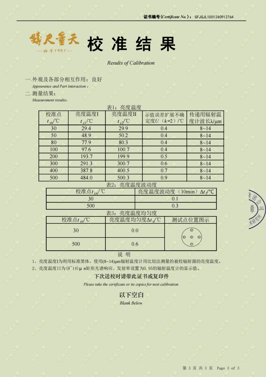面源黑體爐(室溫+5-500℃)校準證書(shū)