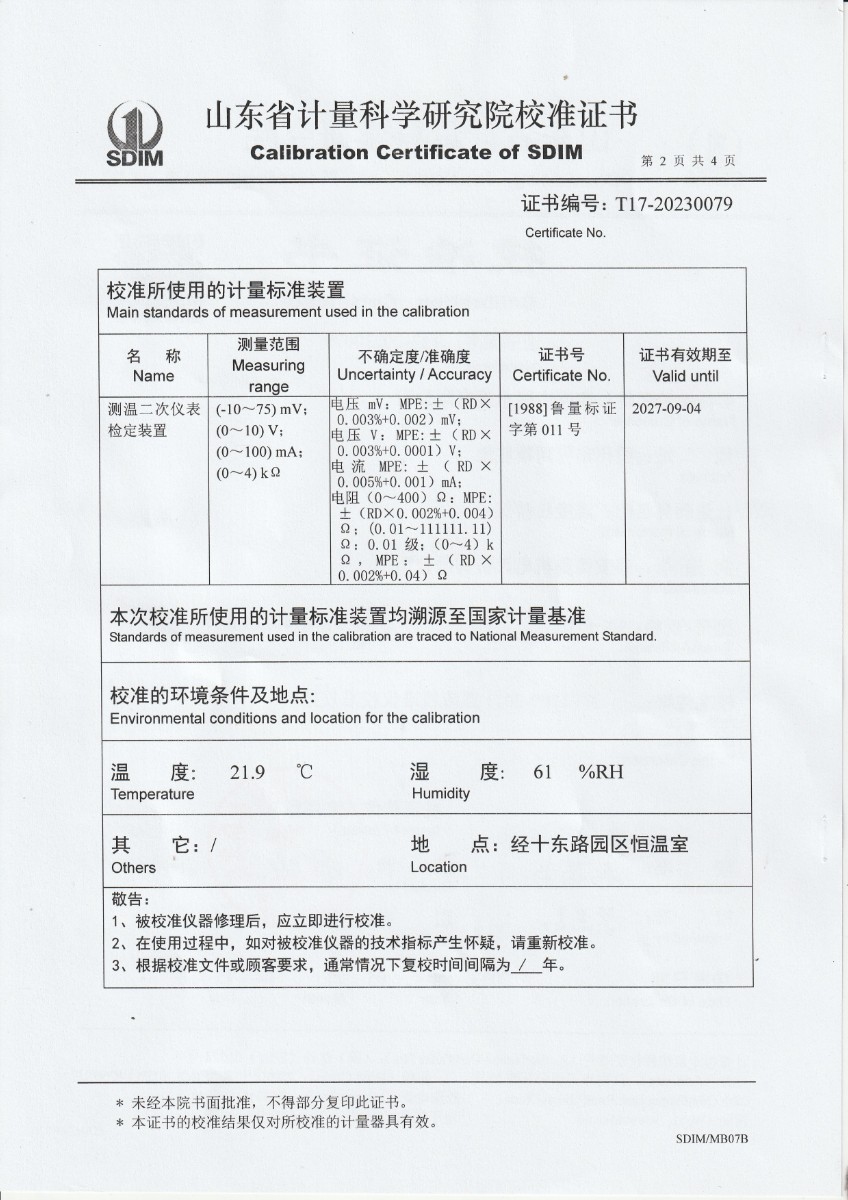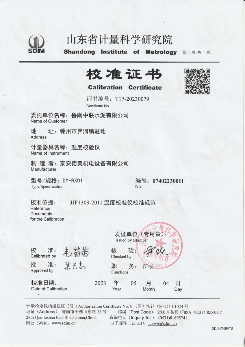 | 上一條:魯南中聯(lián)水泥有限公司 高精度數字溫度計 校準證書(shū) | 下一條:溫濕度檢定箱(-5~65℃)校準證書(shū) |