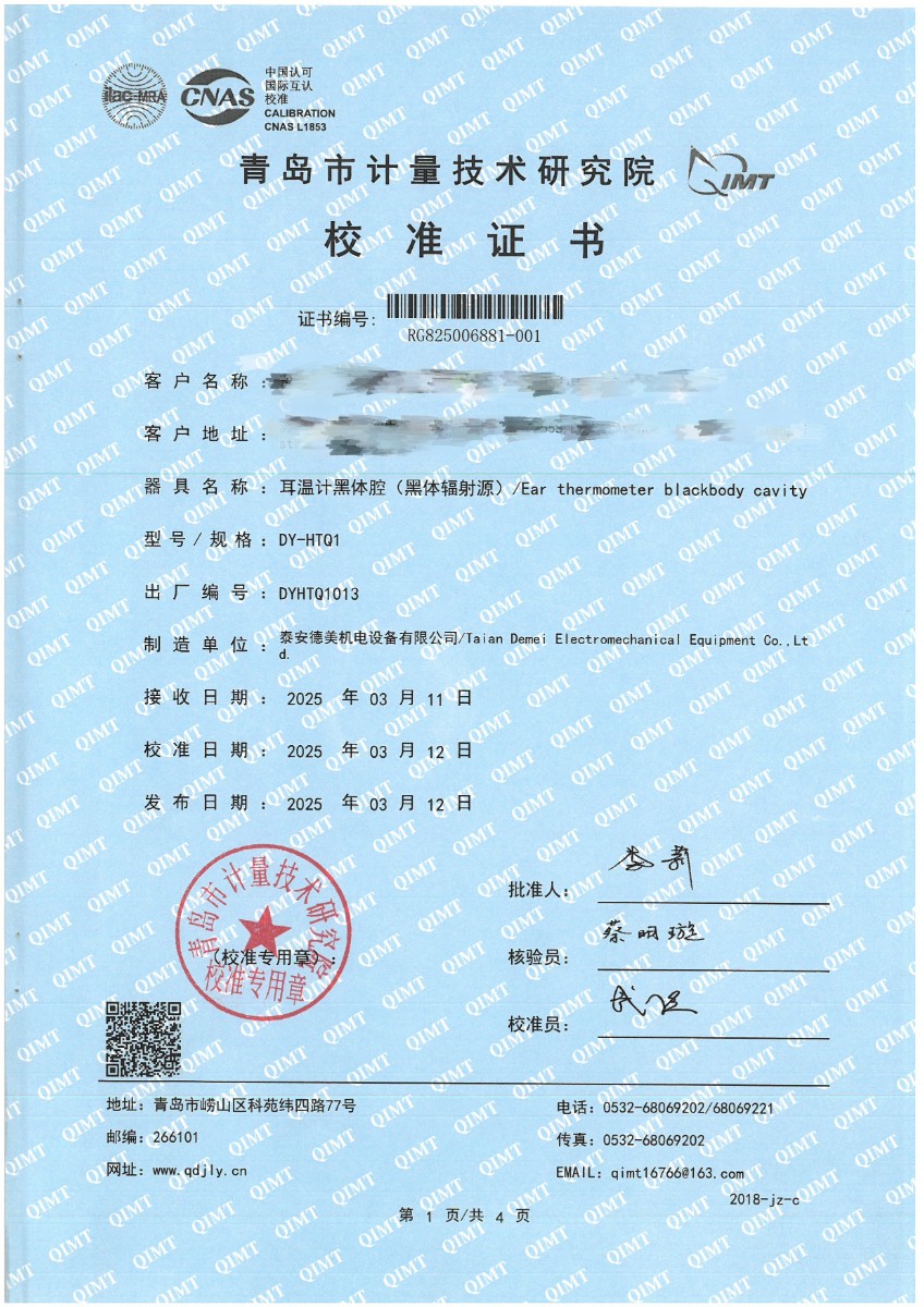 耳溫計黑體空腔校準證書(shū) 2025-3-25 本文被閱讀 4042 次